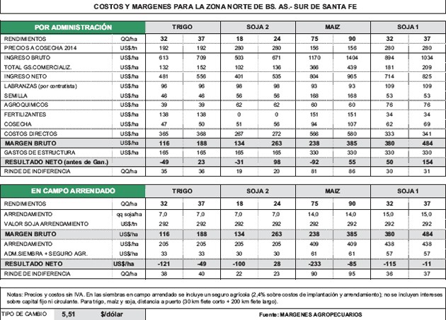 Síntesis: Precios en baja, costos en alza. Proyección de resultados sobre la base de precios proyectados a cosecha 2014 para trigo y granos gruesos en administración campo propio y arrendado.