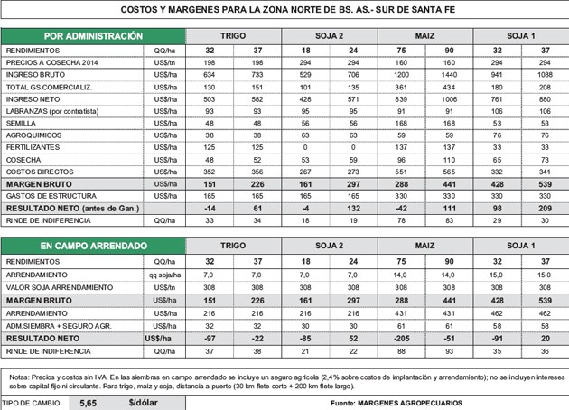 Costos y márgenes para la zona norte de Buenos Aires y sur de Santa Fe