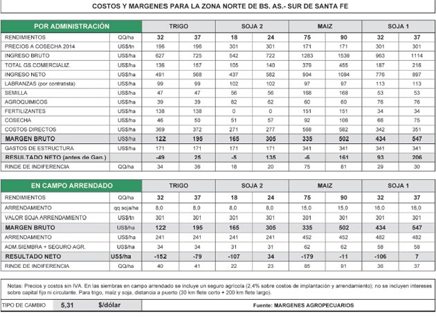 Síntesis: Interrogantes a futuro. Proyección de resultados para la zona norte de Buenos Aires y sur de Santa Fe, sobre la base de los precios proyectados a cosecha 2014 para trigo y granos gruesos. Se presentan las cifras para los cultivos realizados por administración en campo propio, y bajo la forma de arrendamiento en campos de terceros.