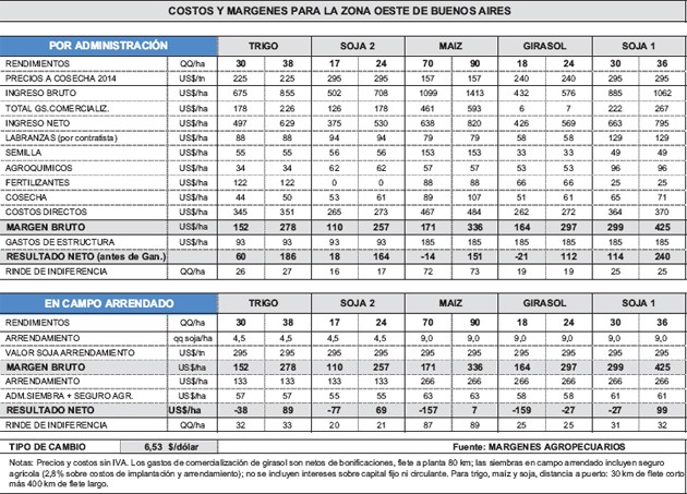 Síntesis: Cultivos complicados. Proyección de resultados para la zona oeste de Buenos Aires, sobre la base de los precios estimados a cosecha 2014 para girasol, maíz, soja, y trigo.