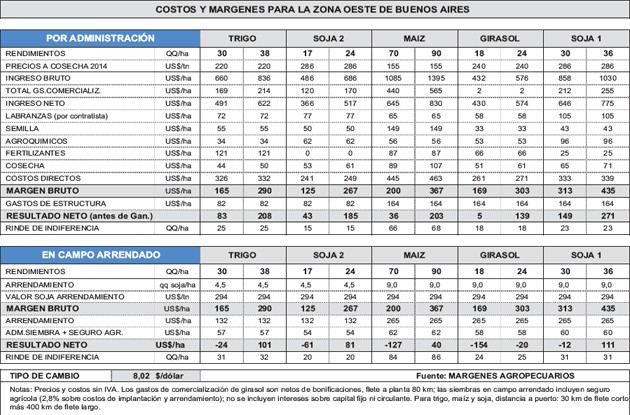 Síntesis: Complicaciones en varios frentes. Proyección de resultados para la zona oeste de Buenos Aires, sobre la base de los precios estimados a cosecha 2014 para girasol, maíz, soja, y trigo.