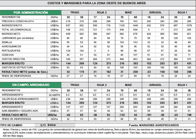 Síntesis: A la espera de lluvias. Proyección de resultados sobre la base de precios estimados a cosecha 2014, para trigo,girasol,maíz y soja en administración campo propio y arrendado.