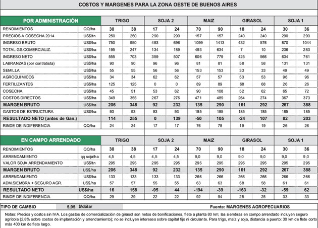 Síntesis: Números complicados. Proyección de resultados sobre la base de precios estimados a cosecha 2014, para trigo,girasol,maíz y soja en administración campo propio y arrendado.