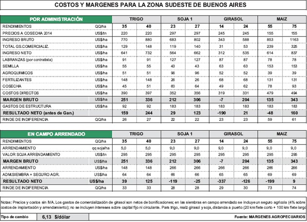 Costos y márgenes para la zona Sudeste de Buenos Aires