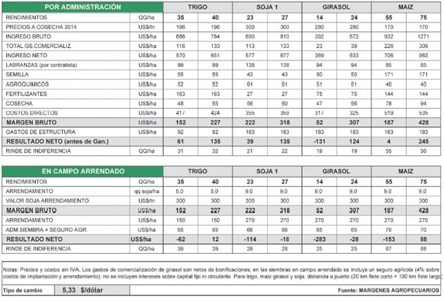 Síntesis: Márgenes agropecuarios: Incógnitas con el trigo. Proyección de resultados sobre la base de los precios estimados a cosecha 2014 para trigo y granos gruesos en administración campo propio y arrendado.