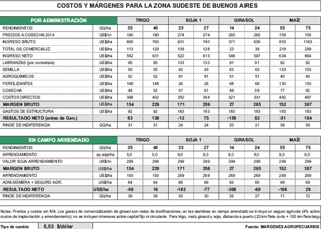 Costos y márgenes para la zona sudeste de Buenos Aires