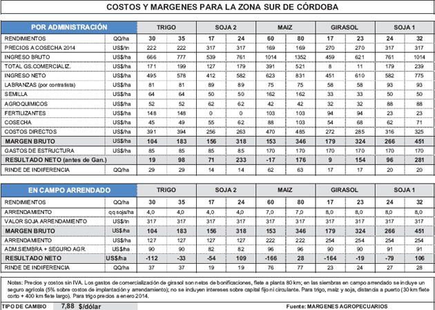 Costos y márgenes para la zona Sur de Córdoba