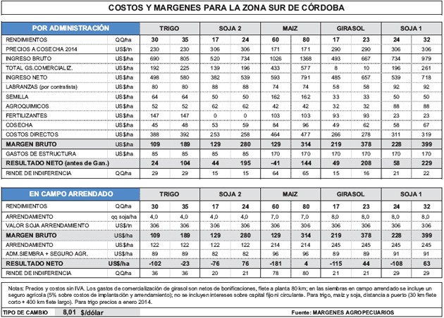 Costos y márgenes para la zona Sur de Córdoba