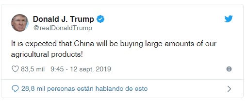 "China prometió comprar productos agrícolas norteamericanos en medio de las negociaciones para dar una salida a la Guerra comercial que mantienen ambos países desde el año pasado", destacó el equipo de analisis de mercado de fyo.