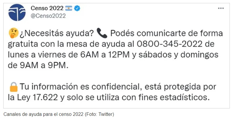La cuenta oficial de Twitter del Censo Nacional de Población, Hogares y Viviendas 2022 publicó los canales de comunicación para solicitar asistencia en caso de no poder completar el cuestionario de manera digital.