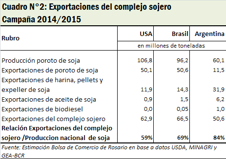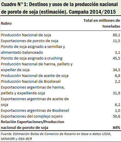 En consecuencia, las exportaciones de poroto de soja y sus derivados ascenderían en el ciclo 2014/2015 a 50,6 millones de toneladas, compuestas por 11,5 millones de toneladas de poroto de soja; 31,9 millones de tn de harina de soja; 6,2 millones de toneladas de aceite de soja y cerca de 1 millón de toneladas de biodiesel. Comparando esta cifra de exportaciones (50,6 millones de toneladas) con la producción nacional de poroto de soja (60,1 millones), vemos que cerca del 85% de la producción de poroto de soja de Argentina se vende al exterior como grano, harinas, aceites y biodiesel.