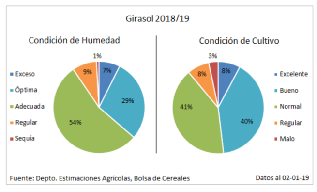 Además, las expectativas de rendimiento relevadas sobre el sur del área agrícola mantienen la proyección de producción en 3.900.000 toneladas, cifra que se ubicaría un 11,4 % superior al ciclo previo (Producción Girasol 2017/18: 3,5 M Tn), informó la Bolsa de Cereales de Buenos Aires con datos relevados hasta este jueves.