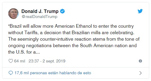 El fin de semana también se conoció que Brasil aprobó una cuota de importación de etanol libre de aranceles 750 millones de litros, algo que fue comentado por Trump en su cuenta de Twitter: