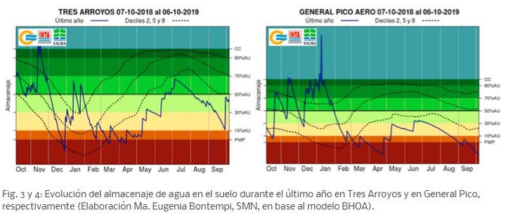 Por el contrario, en la figura 4 se puede observar que ya a partir de mediados de agosto se comenzaba a registrar déficit hídrico en General Pico, que actualmente se encuentra en el límite del punto de marchitez permanente. Las precipitaciones de septiembre presentaron una anomalía negativa que llegó al 75%, debido a que las lluvias acumuladas durante el mes fueron de sólo 13 mm, en comparación con un promedio histórico de 53 mm.