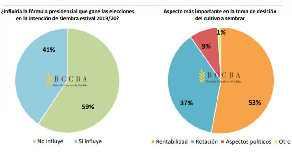 Esto, pese a que un relevamiento que hizo la entidad entre sus colaboradores indica que el 59 por ciento de los productores no toman sus decisiones de siembra en función de quién gane. El 53 por ciento prioriza la rentabilidad como principal factor para adoptar una estrategia, por encima del 37 por ciento que busca cumplir con las rotaciones adecuadas y un nueve por ciento que observa los aspectos políticos.