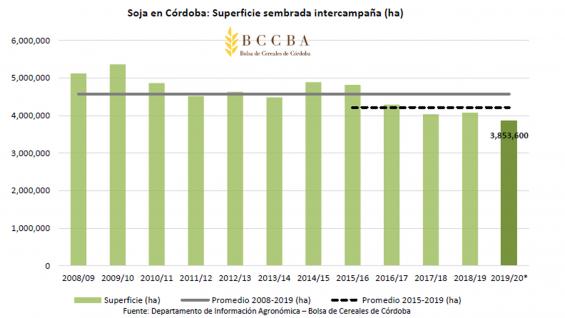 “Con este escenario, la superficie a sembrarse con soja en la campaña 2019/20 se proyecta en torno a las 3.853.600 ha, lo que equivaldría al valor mínimo de la última década y el cual es inferior a la campaña pasada en un cinco por ciento. Respecto al promedio de siembra histórico (2008/19) la disminución es de 16 puntos porcentuales, aunque si se observa únicamente el promedio de las ultimas cinco campañas, esta disminución es del 8,5 por ciento”, precisa el reporte.