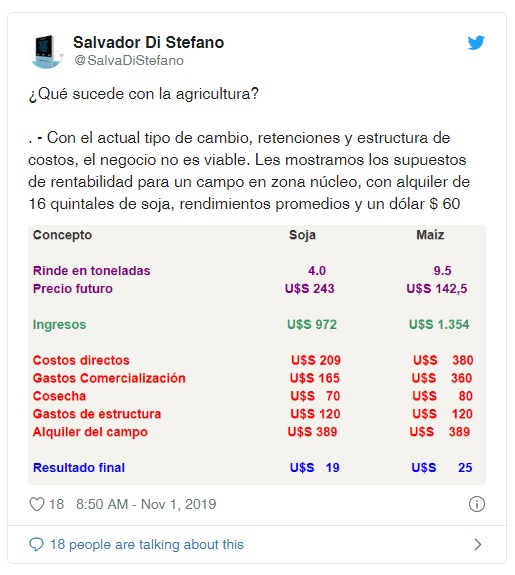 En el mismo tono opinó el analista económico, Salvador Di Stéfano. “Con el actual tipo de cambio, retenciones y estructura de costos, el negocio no es viable”, indicó. Según sus cálculos, en la zona núcleo y pagando un arrendamiento de 16 quintales por hectárea, la soja tiene un resultado de apenas 19 dólares por hectárea y el maíz, de 25 dólares.