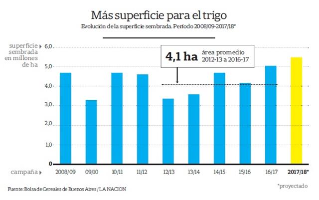 Cuando faltan pocas semanas para el comienzo de la nueva campaña de trigo, la Bolsa de Cereales de Buenos Aires pronosticó una suba del 7,8% en la superficie sembrada. De esta manera, contra los 5,1 millones de hectáreas del ciclo 2016/2017 (la entidad recalculó el área de ese ciclo tras estimar 4,7 millones de hectáreas), la campaña 2017/2018 alcanzará los 5,5 millones de hectáreas.