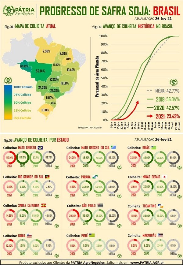 Según la última encuesta de esta consultora, la cosecha de soja está concluida en el 23,43% de la superficie, contra el 42,57% del mismo período del año pasado y el 42,77% de la media de los últimos años. La estimación de consultoría da una cosecha de 129,8 millones de toneladas. "Son números llenos de incertidumbres, con escenarios favorables para los precios, pero preocupantes para el productor rural, que aún no logra sacar esta soja del campo, especialmente en las regiones más al norte de Brasil".