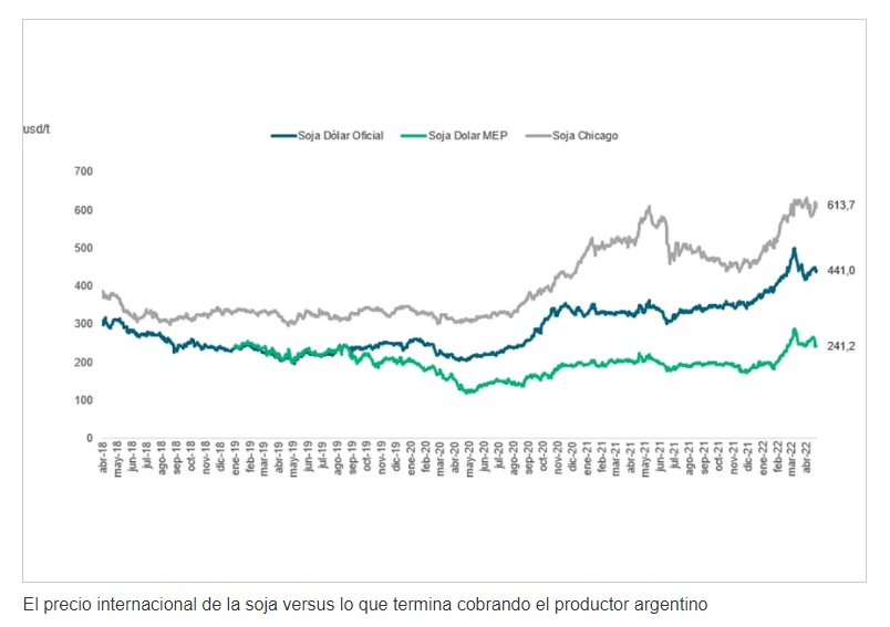 Roca y Tiscornia remarcan en el documento que “los 445 dólares oficiales por tonelada que figuran en las pantallas [esto es, del mercado local] se reducen a poco más de mitad cuando se transforman en dólares reales”, en referencia al MEP.