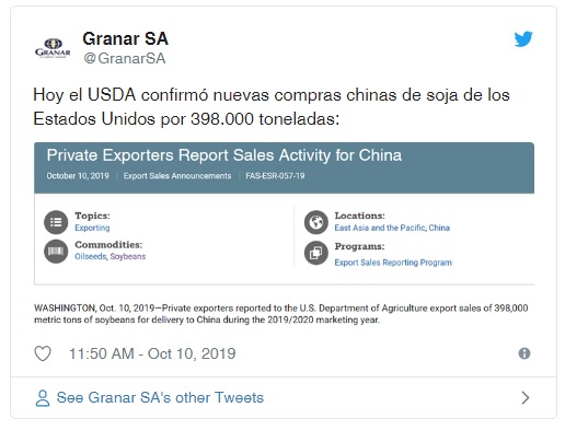Estas importaciones desde el gigante asiático son leídas en el mercado como una muestra de un potencial arreglo de la “guerra” comercial y por eso empujan al alza a este grano. Al mismo tiempo, este jueves se estaba realizando una reunión formal entre negociadores de ambos países para intentar seguir avanzando en una solución.