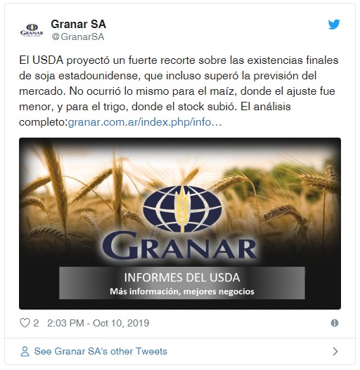 “En soja, los datos relevantes –y alcistas– fueron los ajustes en la cosecha y en las existencias finales estadounidenses, que resultaron mayores a los previstos por los privados. Queda claro, como lo sostuvimos en reiteradas ocasiones en el Panorama Agrícola Semanal, que el ajuste sobre las existencias estadounidenses que no fue hecho por las ventas externas, producto de la guerra comercial con China, fue hecho por el clima”, indicó la consultora Granar.