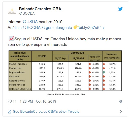 Lo mismo sucedió con los stocks finales 2019/20, que se estiman en 12,5 millones de toneladas, cinco millones menos que en septiembre y también por debajo de las expectativas de los privados: 14,2 millones.