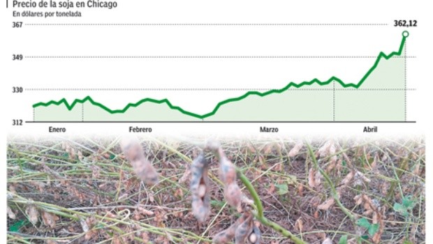 La soja se disparó ayer 3,3%, u u$s 11,50 por tonelada, en el mercado de Chicago, en lo que se constituyó el alza diaria más importante no solo del año sino en los últimos ocho meses, de la mano de la creciente preocupación por los daños que dejará el temporal de más de dos semanas que afectó a buena parte del área productiva argentina.