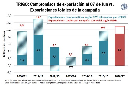 La BCR, a partir de datos provistos por la Unidad de Coordinación y Evaluación de Subsidios al Consumo Interno (Ucesci), las exportaciones comprometidas según las Declaraciones Juradas de Ventas al Exterior (DJVE), Argentina ya anotó 8,9 millones de toneladas de la campaña 2016/17, frente a los 6,9 millones de 2015/16, 3,1 millones de 2014/15 y a las nulas de 2013/14.