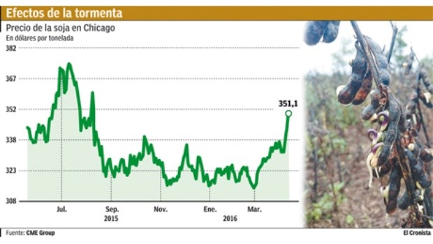 El mal clima que se extiende desde hace dos semanas en gran parte del área productiva argentina, que tiene prácticamente paralizada a la cosecha gruesa y pone en riesgo la producción final de soja local, tuvo ayer un fuerte impacto en las operaciones en el principal mercado de commodities agrícolas mundial, Chicago, donde la oleaginosa se disparó 2% y cerró en u$s 351,1 la tonelada.