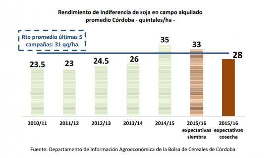 Previo al cambio en las políticas económicas y agropecuarias, un productor que sembró soja en Córdoba debía obtener un rendimiento promedio de 26 quintales por hectárea en campo propio y 33 quintales en campo arrendado para poder cubrir sus costos directos, mientras que el rinde promedio de las últimas 5 campañas a nivel provincial se ubicó en 31 quintales.