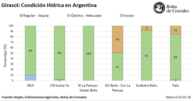 En cuanto al área en pie, un 70 % de la superficie ya transita o supera el estadio de floración, acompañada de una mejora en la condición hídrica del cultivo de 2 puntos porcentuales. Al mismo tiempo mejoró la condición del cultivo a nivel nacional, aumentando en 1,6 puntos el área en condición normal y excelente.