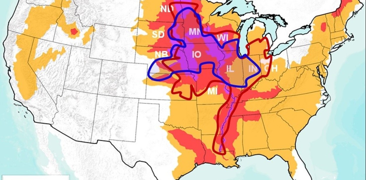 En segundo lugar y volviendo al mundo de los granos debemos profundizar un poco sobre lo que está ocurriendo sobre el Oeste del Cinturón Agrícola norteamericano. Pero antes queremos recordarles que nos acercamos al comienzo de la siembra en el país del norte, que podríamos marcar en el calendario como abril -mayo para maíz y mayo-junio para soja. Y, a propósito de esto, vale recordar que este viernes 29-03 el Departamento de Agricultura de Estados Unidos (USDA, por sus siglas en inglés) hará su reporte formal de área estimada por sembrar (“Prospective Plantings”) en cada uno de los cultivos de la campaña 2019. Contamos esto porque Estados Unidos, se encuentra viviendo una inédita situación de inundaciones muy graves en el Oeste y centro del cinturón agrícola, más específicamente en los estados de Nebraska, Minessota y Iowa, causada por una mezcla de rápido derretimiento de la nieve, grandes lluvias de inicio de primavera y algunas nevadas tardías en zonas donde el suelo ya se encontraba sobre cargado de humedad. La consecuencia de todo esto son grandes inundaciones sobre las márgenes del río Missisipi, aguas arriba y el río Missouri, que desemboca en el primero. Inundaciones que están afectando un superficie importante de la que se siembra con agricultura campaña tras campaña. Para ser más claros, superponemos sobre el mapa de inundaciones de la NOAA (National Oceanic and Atmospheric Administration), el perímetro que delimita las superficies que se siembran con soja, en color rojo, y maíz en color azul.