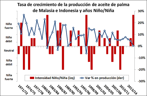 La producción de palma, que cubre alrededor del 35% de la demanda mundial de aceites vegetales y se concentra mayoritariamente en el sudeste asiático, tendrá su peor año desde la campaña 1997/98 en términos de tasa de crecimiento. Tanto en aquel momento como ahora, coincide el hecho de que el fenómeno del Niño se presentó con notable fuerza, alterando los patrones de lluvias y vientos con la consecuencia de generar precipitaciones insuficientes en las zonas de producción de Indonesia y Malasia. Estos dos países abarcan cerca del 85% de la oferta de este producto. Regiones clave como Sabah o Sarawak, ambas ubicadas en la Malasia oriental, recibieron en enero y las primeras semanas de febrero aproximadamente un tercio de las lluvias habituales. La situación ha sido peor en la zona peninsular, ubicada en el continente, cuya participación en la producción del país es poco más de la mitad.