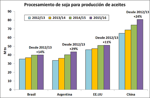 Con oferta más ajustada en palma y colza, el mundo incrementa su dependencia hacia el aceite de soja, el único entre los principales que se encamina a un salto de producción este año respecto del anterior. En la campaña 2015/16 el procesamiento de soja para extracción de su materia grasa será récord y la producción de aceite superará por primera vez en la historia las 50 M tn. Casi todo el incremento en la oferta será absorbido por la demanda, es decir, no se espera que la acumulación de stocks sea significativa.