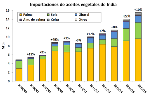 Por el lado de la demanda, se destaca que buena parte del incremento en el comercio se debe a los mayores requerimientos de la India. El USDA proyecta las importaciones de este país para el período octubre-septiembre en 15,5 M tn, un 10% más que a lo largo del ciclo 2014/15. El año pasado las compras externas de aceites ya se habían incrementado un 22% frente a la campaña anterior. Esta situación está asociada a la menor producción doméstica. De hecho, el procesamiento local para elaboración de aceites acumula una disminución cercana al 40% en los últimos tres años. Según Oil World, este año el 77% del consumo del segundo país más poblado del mundo será cubierto con importaciones, frente a 64% hace cuatro años. En este contexto, otros importadores han tratado de acumular stocks anticipando menor disponibilidad de oferta durante los próximos meses.