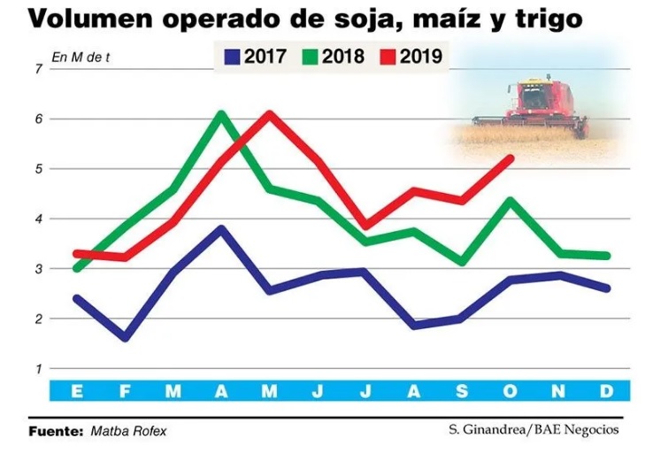 Los datos fueron consignados por un informe del Matba-Rofex, que además señaló que el interés abierto aumentó un 4% respecto a octubre 2018 hasta promediar las 6 millones de toneladas por día.