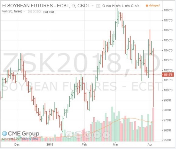 Esto llevó este miércoles a que el precio de la soja descendiera más de US$ 15 en la apertura del mercado de granos de Chicago. La soja en contrato a mayo perdía US$ 15,2 y se cotizaba a US$ 366,2 la tonelada, luego de que China anunciase que impondrá un arancel del 25%, tanto a la soja, como a maíz, trigo, carne, algodón, automóviles, entre otros productos.