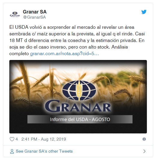 La consultora Granar, en este contexto, coincidió en que “la mayor sorpresa del reporte estuvo en el espacio del maíz, dado que el organismo mantuvo un área sembrada por encima de las expectativas de los operadores, al igual que el rinde promedio”.