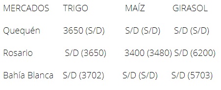 A continuación, un listado de los precios de los cereales y oleaginosas en los principales puertos de Argentina. Los valores de la sesión anterior están entre paréntesis. Todas las cifras están expresadas en pesos por tonelada.