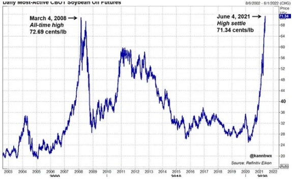 June 4: Most-active CBOT soybean oil futures end at 71.34 cents/lb, a record high settle. That follows Thursday's near all-time high of 72.13, just 56 points (0.8%) off the March 4, 2008 top. High prices are supported by global vegoil demand & an expected tightening of supplies. pic.twitter.com/iozPqzwWPH — Karen Braun (@kannbwx) June 4, 2021