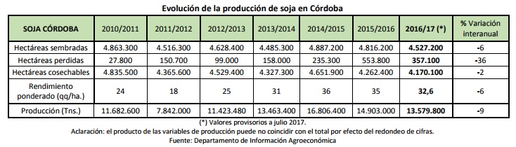 Según un informe de la Bolsa de Cereales provincial, la cosecha de la oleaginosa está prácticamente finalizada en territorio cordobés y arrojaría una producción estimada de 13.579.800 toneladas, nueve por ciento por debajo del ciclo pasado, y la menor cifra desde el ciclo 2013/14.