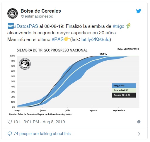 La Bolsa de Cereales de Buenos Aires dio por finalizada la siembra de trigo 2019/20.