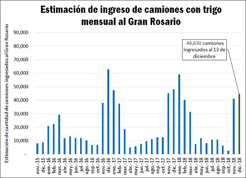 En la primera quincena de diciembre se aceleró el ingreso de camiones a la zona del Gran Rosario. La estimación en base al indicador de ingreso de camiones, elaborado en base a los datos de Williams Entregas, indica que más de 44.000 camiones cargados con trigo que ingresaron a la zona, aumentando un 70 % respecto a lo ingresado en los primeros 15 días de diciembre 2017.