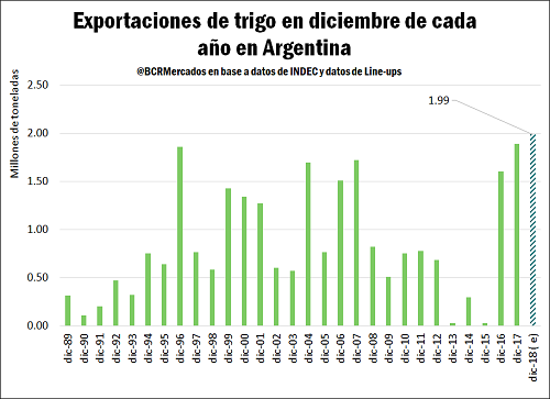 Según datos estimados de Line-ups, y comparando con datos de exportación de meses anteriores del INDEC, diciembre sería el mes de mayor exportación de trigo. Se estiman según datos de buques cargados y buques por cargar que se podrían llegar a exportar hasta 2 Mt, siendo el valor más alto de al menos los últimos 30 años.