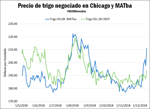 A nivel bursátil, se observó una fuerte correlación de precios entre el precio del contrato de trigo de MATba con entrega Diciembre y el contrato de trigo blando negociado en Chicago, al menos desde el mes de agosto hasta la fecha (coeficiente de correlación de 0.87). Ambos países se encuentran en una situación similar, compiten en mismos destinos de exportación, y aunque no parezca, poseen distancias muy similares en los destinos de exportación (Mediterráneo y Mar Meridional de China).