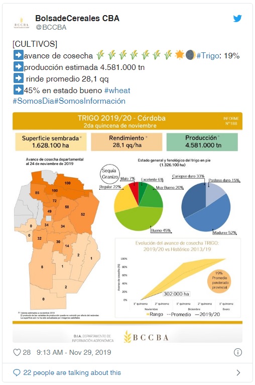 Con un avance del 19 por ciento en la recolección del trigo, el volumen estimado es de 4,58 millones de toneladas, producto de una siembra que alcanzó 1,6 millones de hectáreas y un rinde promedio que se calcula en 28,1 quintales.