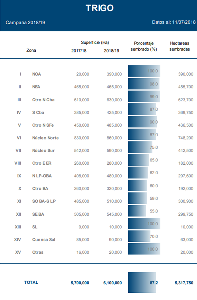 Por su parte, la Guía Estratégica para el Agro que elabora la Bolsa de Comercio de Rosario informó que la superficie nacional de trigo alcanzaría las 6,18 millones de hectáreas, por lo cual aún quedarían algo más de 800000 hectáreas por sembrar. Esta estimación afirma la #revanchadeltrigo, fortaleciendo la posibilidad de establecer un nuevo récord productivo de 20 millones de toneladas en la actual campaña.