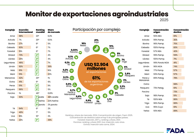En 2025, Argentina exportó 87.076 millones de dólares en total. De ese monto, 52.900 mill/dol provinieron de las cadenas agroindustriales (CAI), lo que representa 61 % del total de las ventas externas del país, es decir, 6 de cada 10 dólares que ingresan por exportaciones.