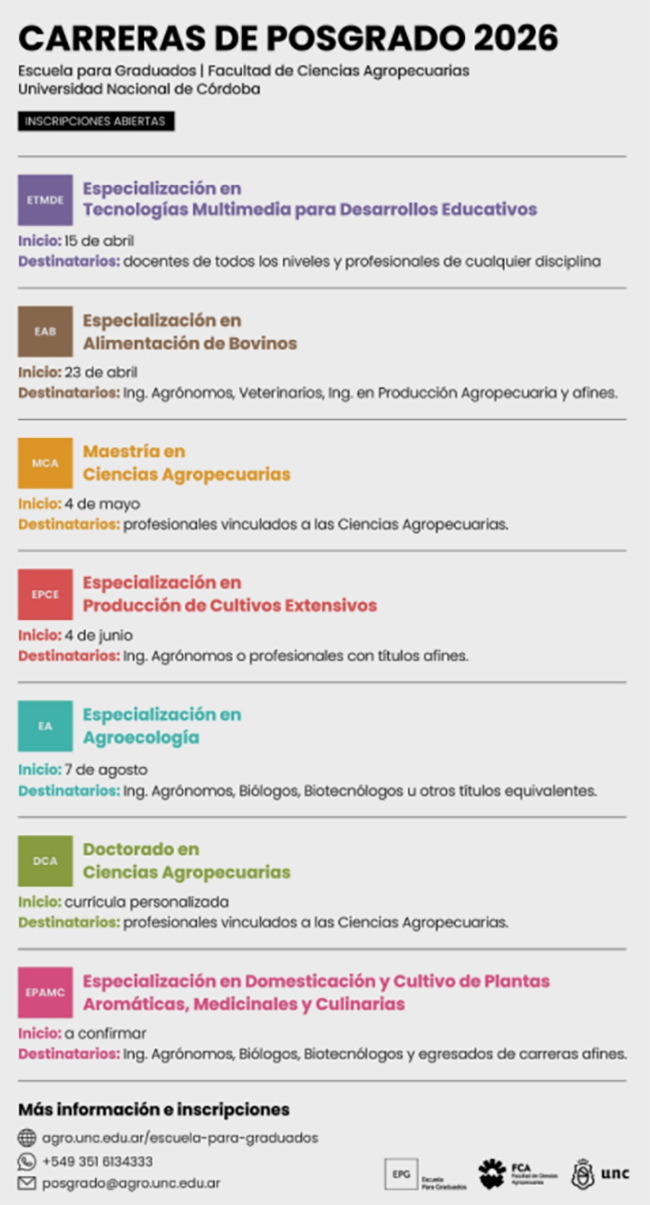 Toda la información se encuentra en el sitio oficial: https://agro.unc.edu.ar/escuela-para-graduados/